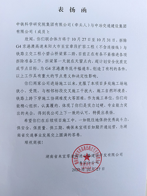 表扬信中指出,中冶交通联合体承建的铁路立交工程小碧山桥梁第二跨拆除工作于10月27日启动。施工首日,项目团队在有限的天窗点内安全、优质、高效地超额完成节点目标,为G4京港澳高速实现2025年底半幅通车的重大节点奠定了决定性基础。