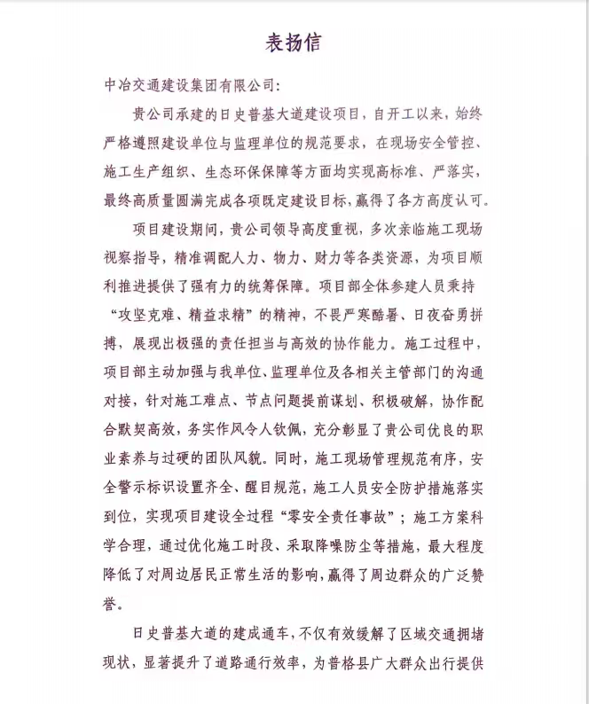 信中提到,由四川分公司承建的日史普基大道建设项目,自开工以来,始终严格遵照建设单位与监理单位的规范要求,在现场安全管控、施工生产组织、生态环保保障等方面均实现高标准、严落实,最终高质量圆满完成各项既定建设目标,赢得了各方高度认可。项目建设期间,四川分公司领导高度重视,多次亲临施工现场视察指导,精准调配人力、物力、财力等各类资源,为项目顺利推进提供了强有力的统筹保障。项目部全体参建人员秉持“攻坚克难、精益求精”的精神,不畏严寒酷暑、日夜奋勇拼搏,展现出极强的责任担当与高效的协作能力。施工过程中,项目部主动加强与业主单位、监理单位及各相关主管部门的沟通对接,针对施工难点、节点问题提前谋划、积极破解,协作配合默契高效,务实作风令人钦佩,充分彰显了中冶交通优良的职业素养与过硬的团队风貌。同时,施工现场管理规范有序,安全警示标识设置齐全、醒目规范,施工人员安全防护措施落实到位,实现项目建设全过程“零安全责任事故”;施工方案科学合理,通过优化施工时段、采取降噪防尘等措施,最大程度降低了对周边居民正常生活的影响,赢得了周边群众的广泛赞誉。