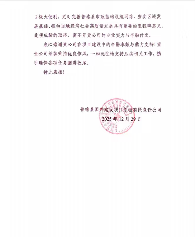 近日,四川分公司日史普基大道项目收到普格县国兴建设项目管理有限责任公司发来的表扬信。