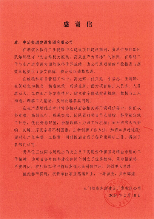 三门峡项目收到了来自三门峡东辉建设开发有限公司的感谢信,信中说,该项目团队展现了央企员工高度责任担当和精益求精的品质坚守,得到了业主单位各部门一致认可,也为三门峡湖滨区各建设单位树立了榜样。
