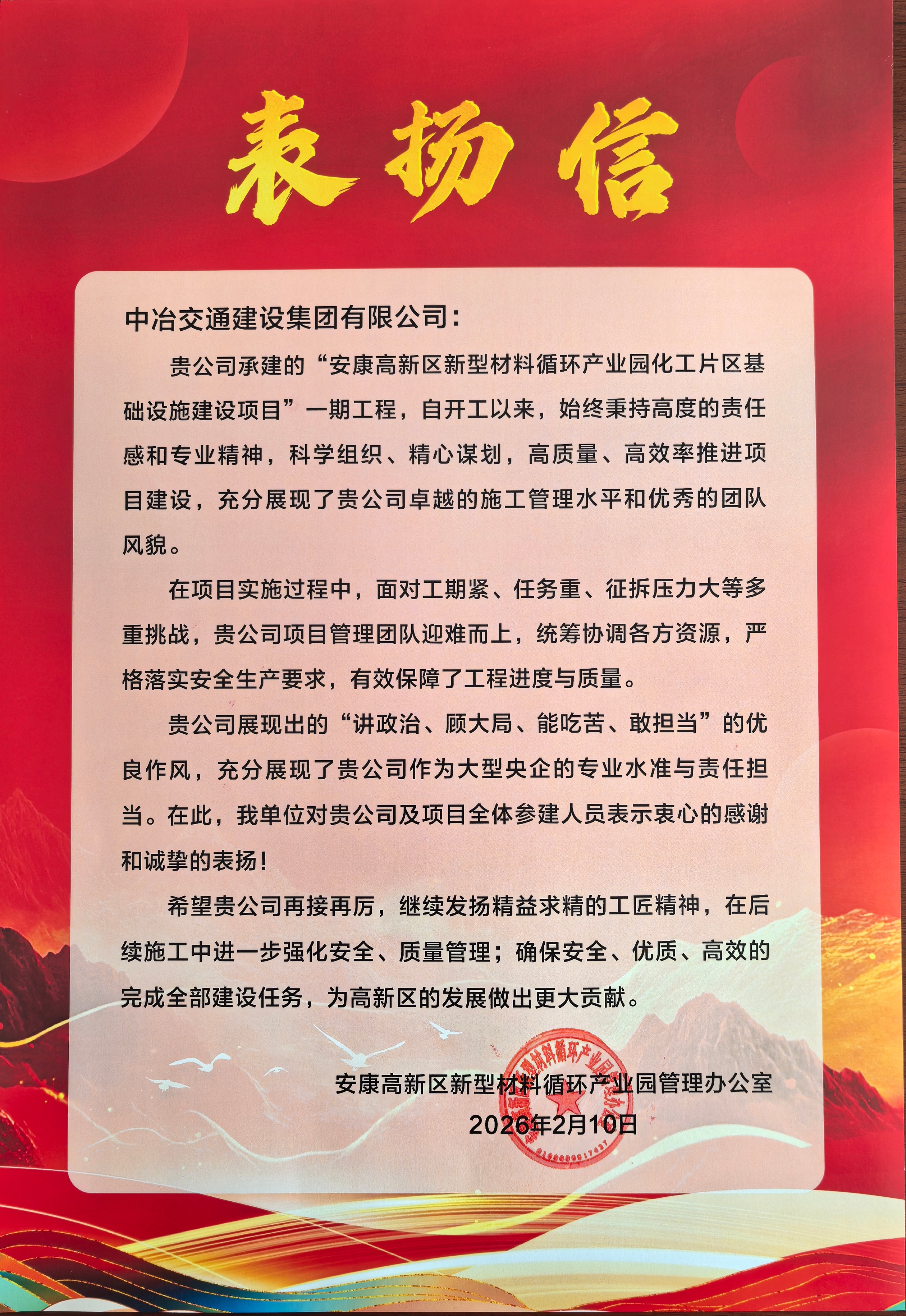 安康高新区循环产业园基础设施建设项目是“安康高新区循环产业园化工片区”评定的重要配套设施,对化工片区的评定工作意义重大,项目自进场以来,面对诸多问题及挑战迎难而上,高标准、严要求的推进各项工作。凭借卓越的工程品质、高效的施工管理,赢得了建设单位的高度认可与书面表扬。