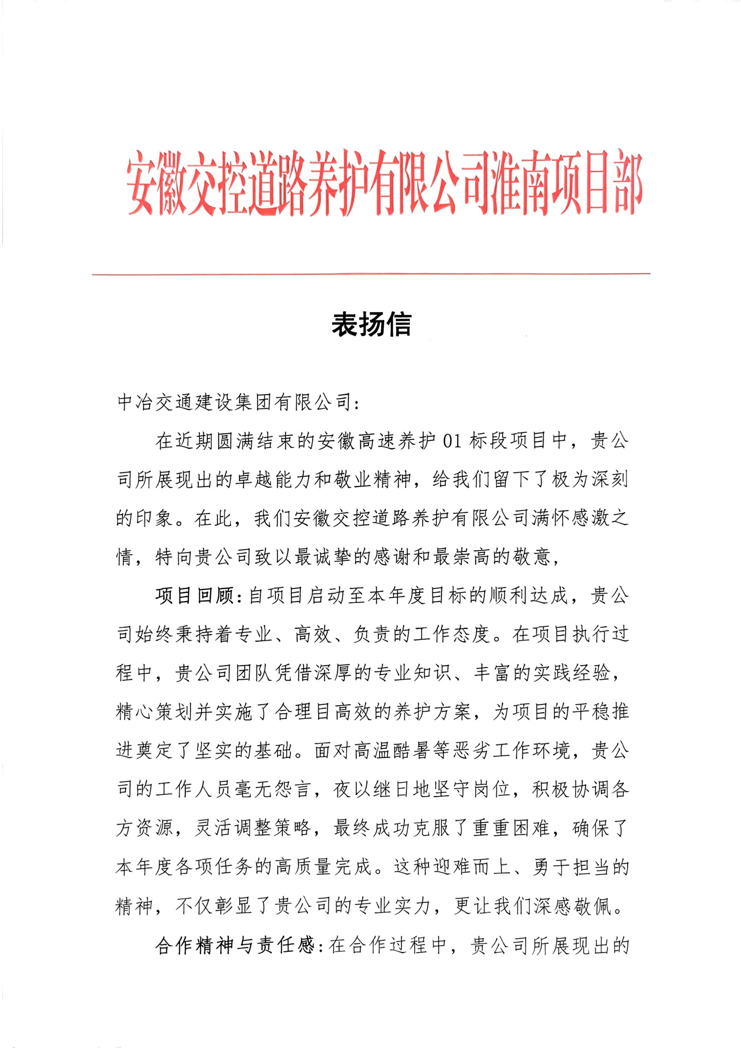 近日,设计研究院(BIM中心)安徽高速养护01标段项目收到安徽交控道路养护有限公司淮南项目部发来的表扬信,信中对项目部全体人员的卓越表现、专业能力和敬业精神给予高度评价,对项目团队高质量完成年度养护任务表达诚挚感谢。
