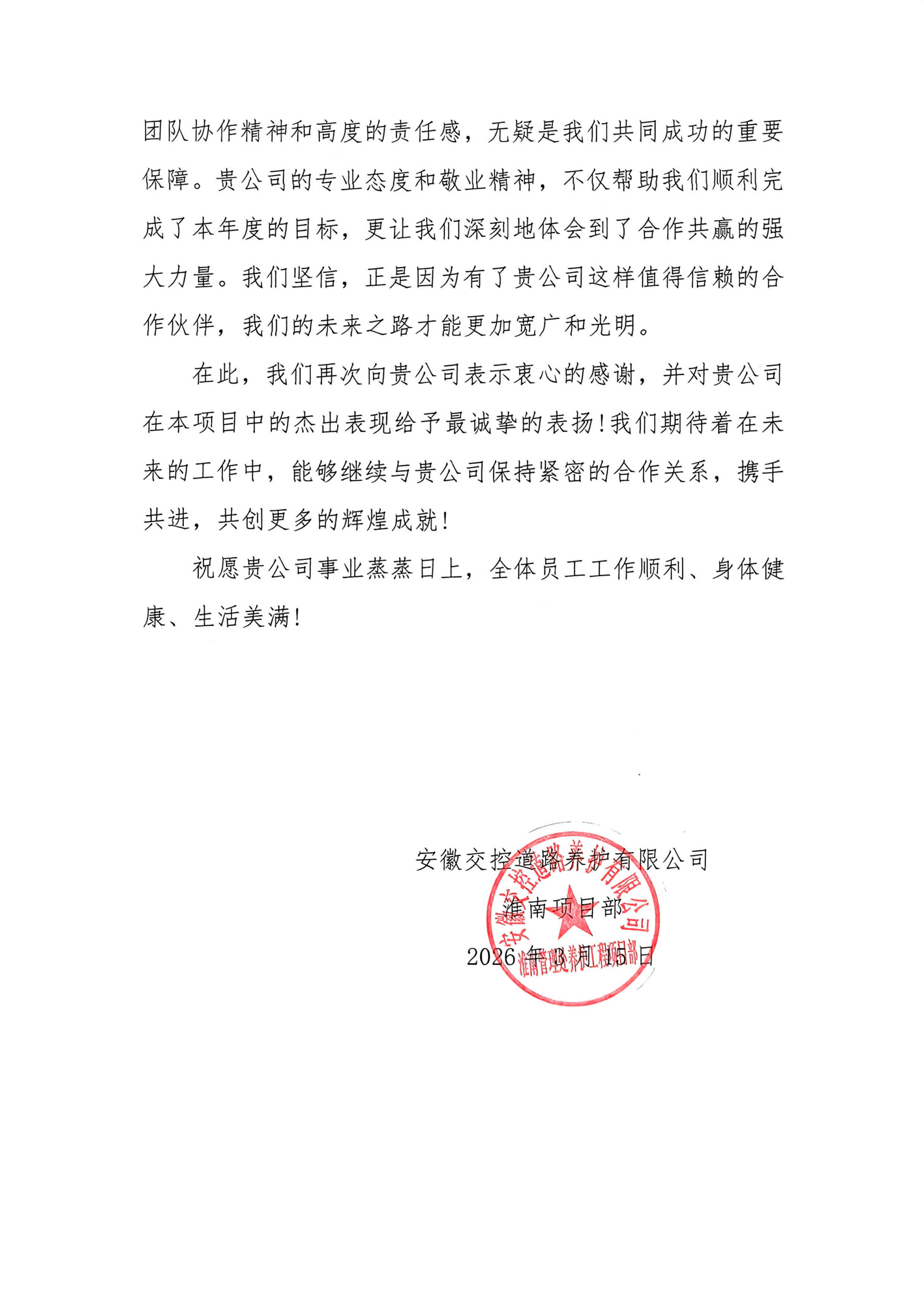 安徽交控养护有限公司淮南项目部在表扬信中指出,安徽高速养护 01 标段项目团队秉持专业、高效、负责的工作态度,依托扎实的专业知识与丰富实践经验,结合项目实际精心策划并高效实施养护方案,为项目平稳推进筑牢基础。合作过程中,设计研究院(BIM 中心)展现出的优秀团队协作精神和高度项目责任感,是双方合作成功的重要保障。项目团队的专业与敬业,不仅助力业主顺利达成年度工作目标,更让双方深刻体会到合作共赢的强大力量,为后续持续深化合作奠定了坚实的信任基础。